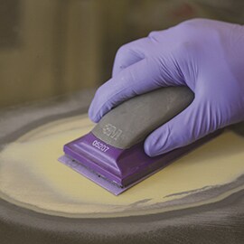 Final block sand the body filler using a 150 grade abrasive. Apply 3M™ Dry Guide Coat to highlight remaining imperfections in the repair area. Continue block sanding with the 150 grade abrasive and reapply the dry guide coat if necessary. Next, fine feather-edge the repair area using a DA sander and a 180 grade abrasive. If necessary, blow off the repair area with clean, dry compressed air, re-apply the dry guide coat and continue DA sanding to remove any defects as required. This step will leave a refined finish for primer or glaze (if glaze is required).