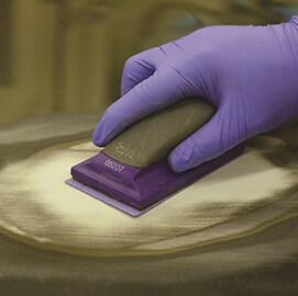 Small amounts of paint or other coatings can remain on the panel following initial prep sanding, especially in “low spots”. To remove them it is important to choose abrasives that are aggressive, yet leave a smooth finish. 3M recommends removing all remaining contaminants using a Scotch-Brite™ Clean and Strip abrasive disc. Next, use a 3-in. grinding disc to remove weld nuggets and other surface imperfections. Blow off the entire vehicle with clean, dry compressed air and re-clean it with surface cleaner.