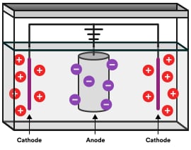 Type II anodizing is most commonly done using a sulfuric acid solution, though other acids and combinations of acids can be used. This “regular” anodization takes place at room temperature and uses 10-20 volts to create a layer 0.1 to 0.8 mils thick. Type II anodizing creates a harder finish than Type I and is used for military-grade components, shells for computers and other electronics, hydraulic valve bodies and mechanical hardware.