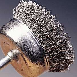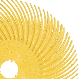 Scotch-Brite Bristle discs and brushes offer the cleaning and corrosion removal of a wire brush without the threat of injury. The discs and brushes have abrasive-filled bristles that apply a continuous, fresh supply of mineral - without damage to the underlying surfaces. The work-piece brushes away the inert material to expose abrasive that is harder and more conformable than a wire brush. It slashes away at paint or corrosion. When one grain of abrasive is used up, another is there to take its place. Durable yet flexible, Scotch-Brite Bristle brushes can clean rust from the inner edges of a screw or housing, while leaving the surrounding metal undisturbed. While they conform to contours, they work equally well on flat surfaces. In performance tests, Scotch-Brite Bristle radial brushes cut faster and more efficiently than wire brushes. On materials such as mild carbon steel, they outperformed .014 mm wire brushes as much 10 to 1 in cut-rate testing2. Scotch-Brite Bristle discs and brushes are available in an assortment of styles, grades and sizes for use on a variety of tools in every application, including: