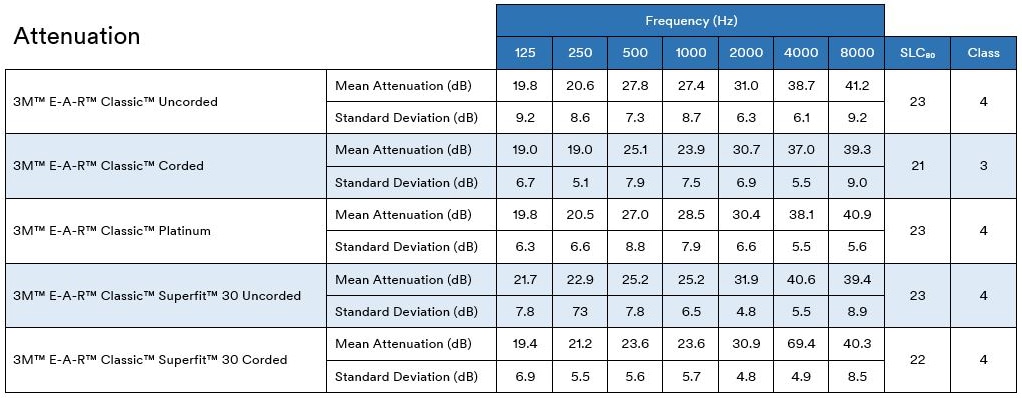 Attenuation is the measure of sound reduction levels achieved by a hearing protector. Attenuation levels of a foam earplug can be affected by the chemistry of the material used; this includes its density, the foam cell structure as well as its physical shape. The attenuation values of 3M™ E-A-R™ Classic™ Earplug are provided below.